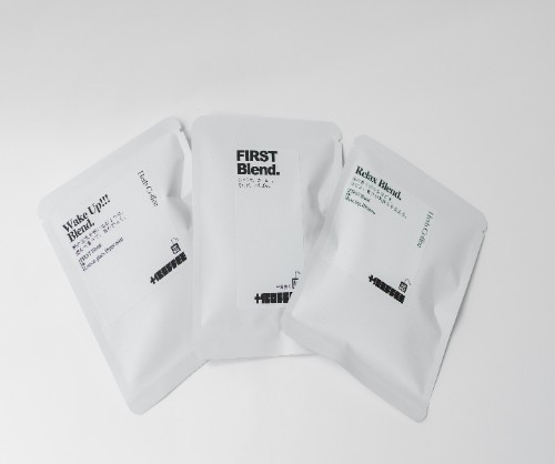 Herb coffee FIRST Blend.(2 50円・税込)、同 Wake Up!!! Blend. (300円・税込)、同 Relax Blend.(3 00円・税込)(各1杯分)