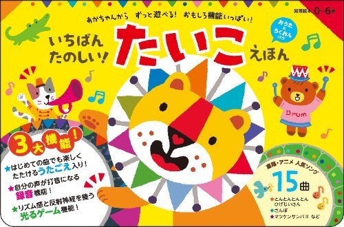 「こんな商品がほしかった!」─の声から生まれた、今までにない新しいたいこの絵本が登場! 初めての曲でも楽しくたたける「歌声入り」+リズム感と反射神経を養う「光るゲーム」に加え、自分の声が打音になる「おしゃべりたいこ」機能も搭載。うれしい3大機能で、どの商品よりもいちばん楽しくたたけます♪ 対象年齢0〜6歳。
