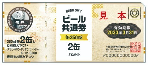 全国の酒屋さんで券面表記の通り、缶350ml 2缶と引き換えできる商品券。ビールが好きな方へのギフトにも◎。有効期限アリ。※応募は20歳以上方のみ。