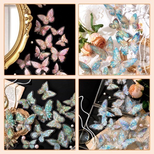 金箔で縁取られたレーザー防水シールでできています。キラキラと輝く蝶は立体感があり、光の角度によってさまざまなまばゆい色に屈折します。