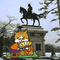 伊達政宗の銅像があるニャがね〜。これがあの独眼竜ニャがね。でもこの銅像にはちゃんと両目があるニャがね?